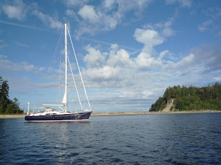pulling into Friday Harbor by 3 pm. Weather is coolish, but an outstanding time is had by all... lots to learn between chart-reading, familiarizing ourselves with all the navigation instruments, and getting used to our new digs aboard Heron and her galley kitchen. Highlight of the day is threading our way through Cattle Pass, called perhaps "the wildest spot in the San Juans" by our cruising guide, a place where currents can run 8-9 knots with wide tide swings. At the wheel, we can feel sudden rips pushing Heron to starboard, but make our way carefully past the rocks marking the entrance to San Juan Channel.